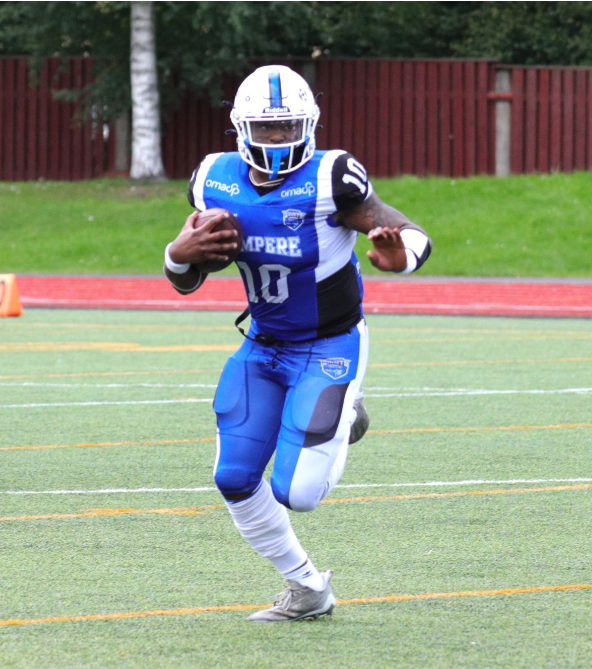 Tampereen hyökkäystä ja QB:ta Jessie Robbins JRia on vaikea pysäyttää. Kuva: Laura Helminen.