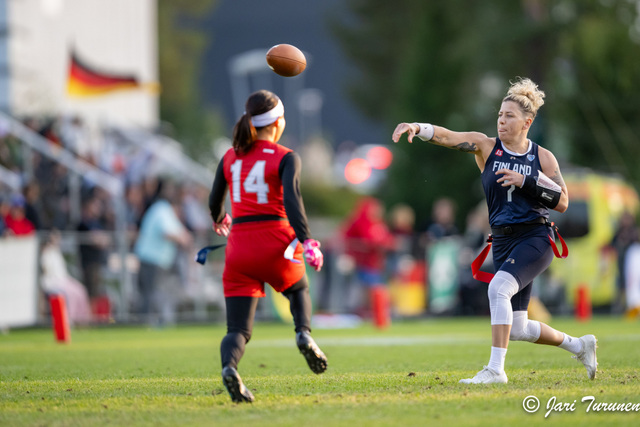 Lea Kazsasin johtama hyökkäys on heittänyt ottelua kohti 213 jaardia. Neljänneksi eniten turnauksessa. Kuva: Jari Turunen