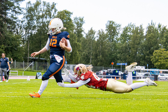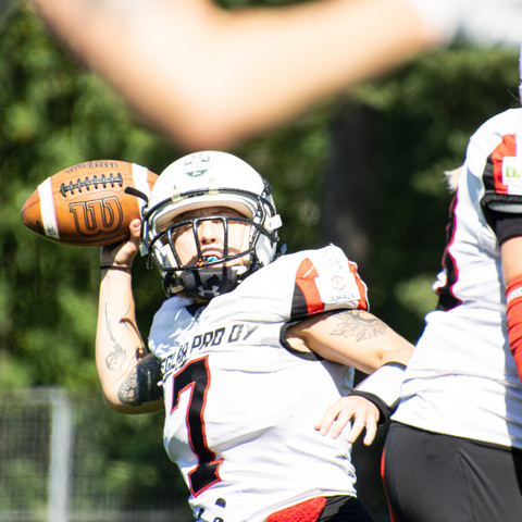 Pudotuspelijoukkueista Trojans on luottanut myös heittopelinsä toimivuuteen. Lea Kaszas heitti runkosarjassa 1214 jaardia ja 22 touchdownia. Kuva: Aino Raki